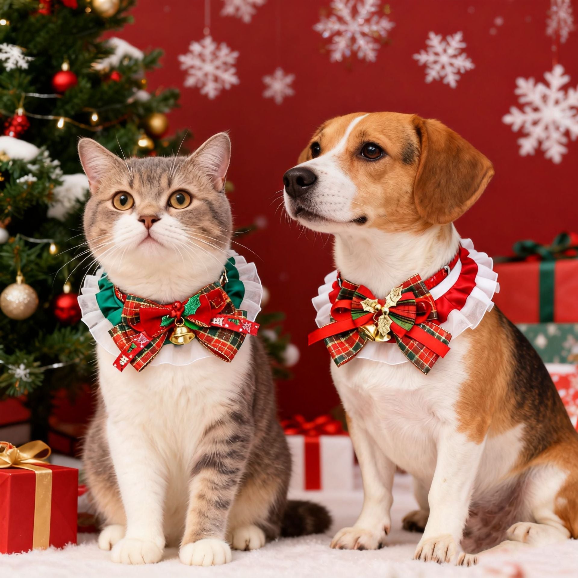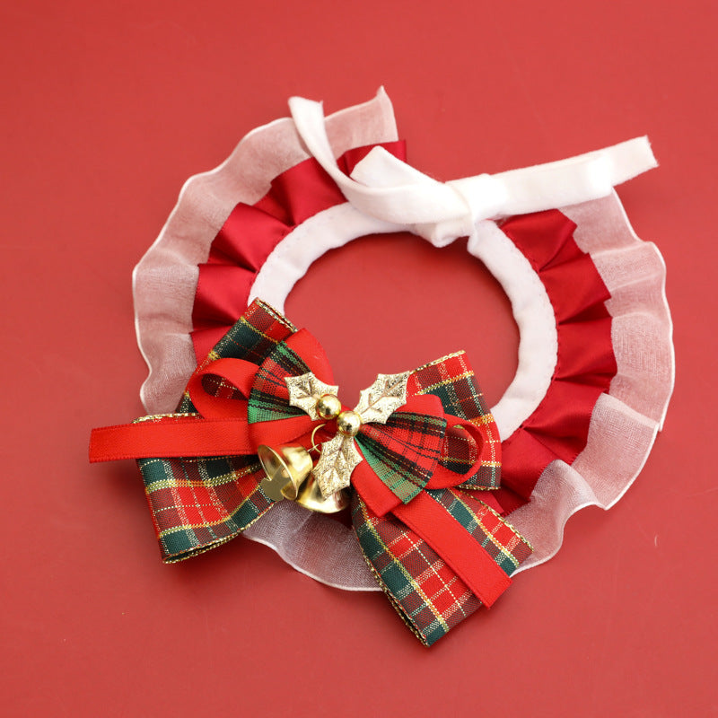 This series presents festive pet collars ideal for Christmas celebrations, suitable for both cats and dogs. The collars feature elegant ruffled edges—one with a green base and the other with a red base, both complemented by white lace details. Each collar is decorated with a prominent plaid bow, accented with golden bells and Christmas-themed elements like holly motifs. The classic red, green, and plaid color scheme, along with the delicate bell embellishments, creates a warm and joyful holiday atmosphere, making pets look charming and festive during the Christmas season.